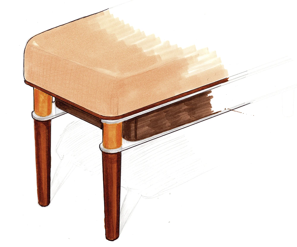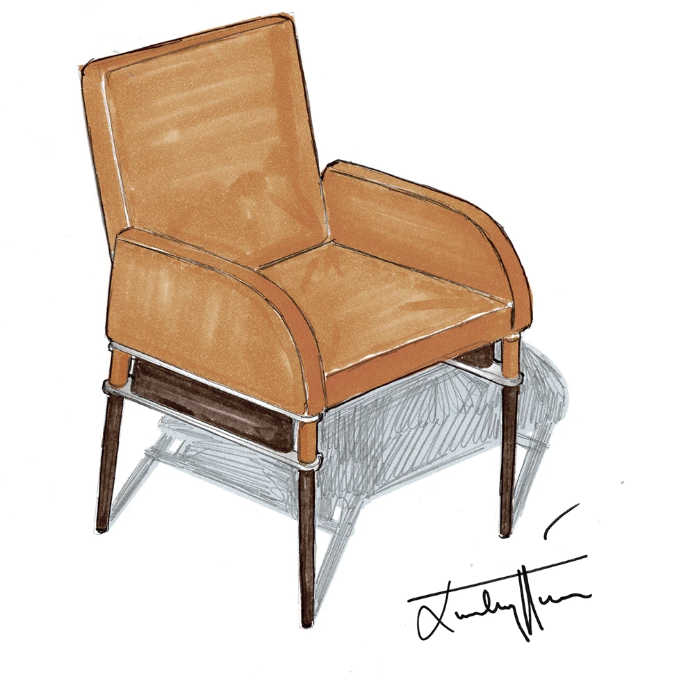 Les longerons en laiton chromé, par exemple, ont pour fonction de faire la jonction entre les pieds et les cadres en bois. Le cuir, quant à lui, renforce le sentiment de confort et de bien-être et suscite une expérience tactile unique.